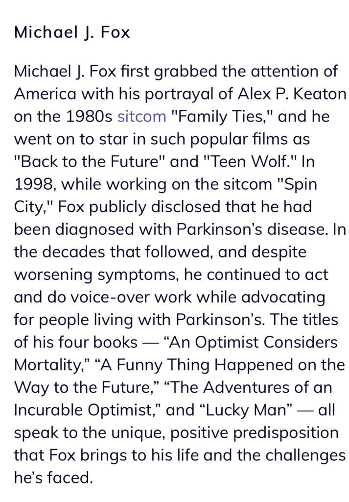 - VIP Fox Representative for the Michael J Fox Foundation and Muhammad Ali Parkinson Center”